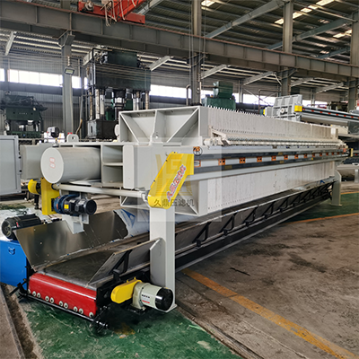 液壓開合式儲泥斗:儲泥斗采用Q235鋼板焊接而成。工作時,由液壓油缸(單面雙油缸)活塞桿帶動扇形門的開合。卸料時,扇形門關閉,用于儲存濾餅,便于卡車的運輸。