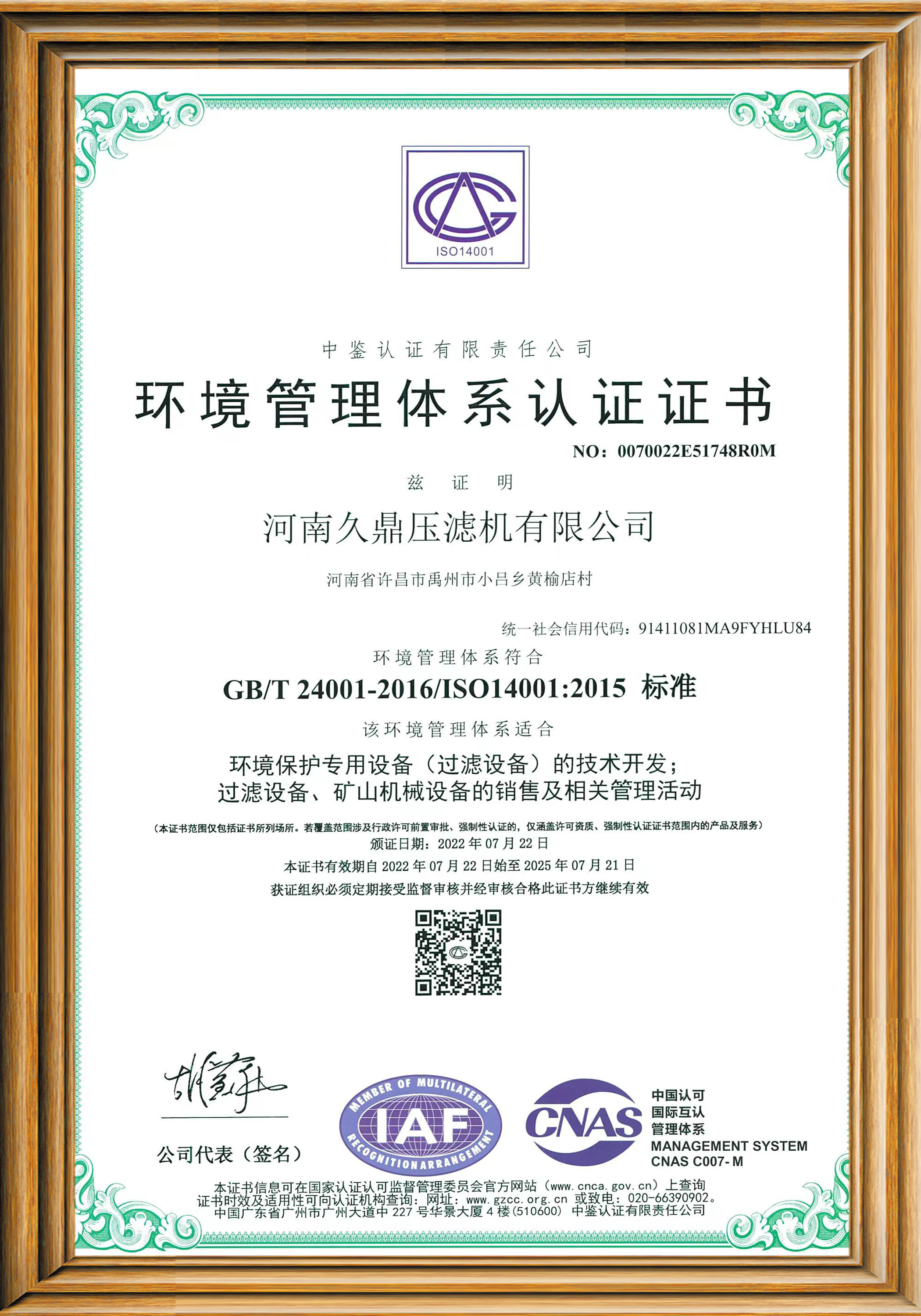 環境管理體系認證證書