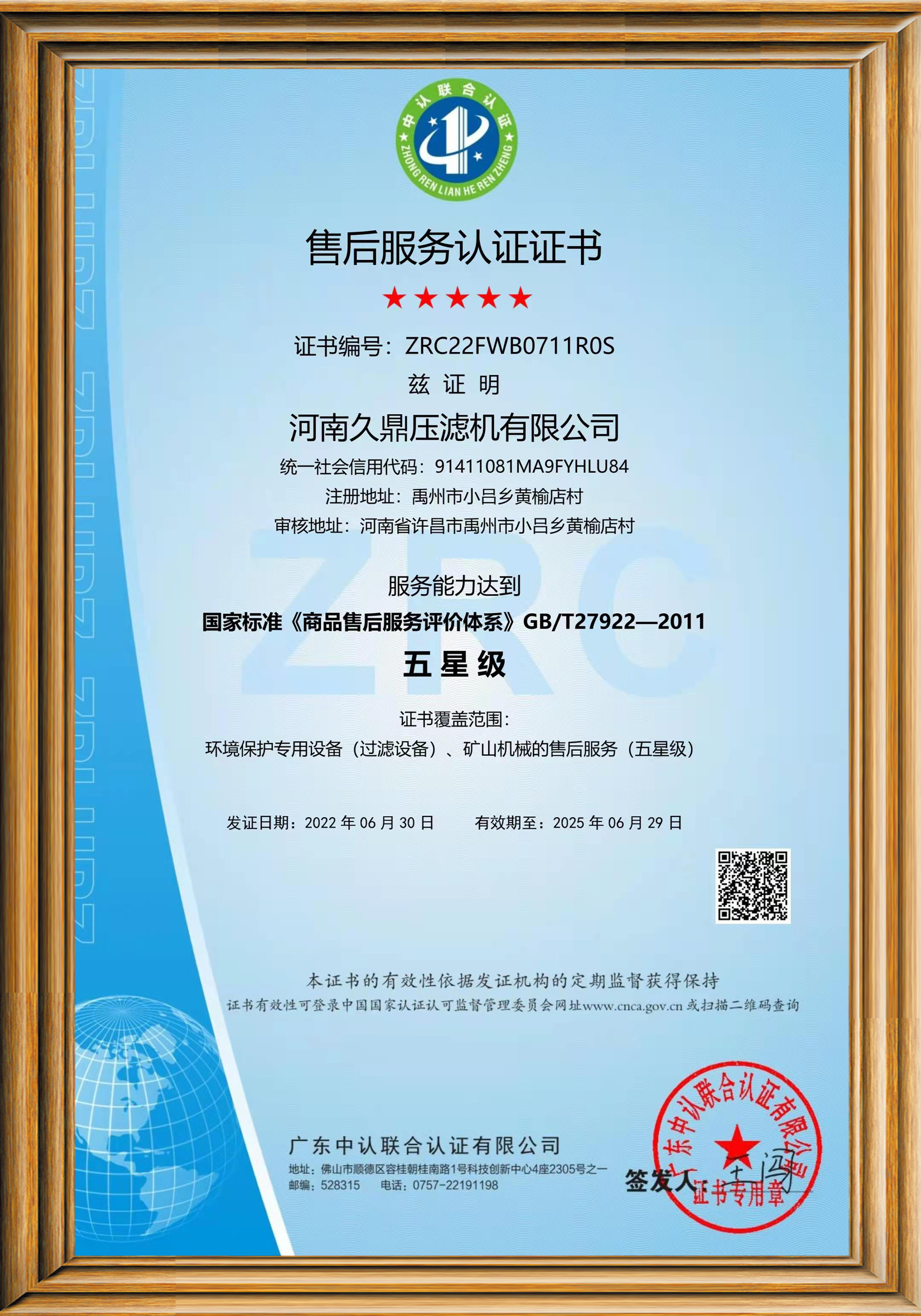 售后服務認證證書