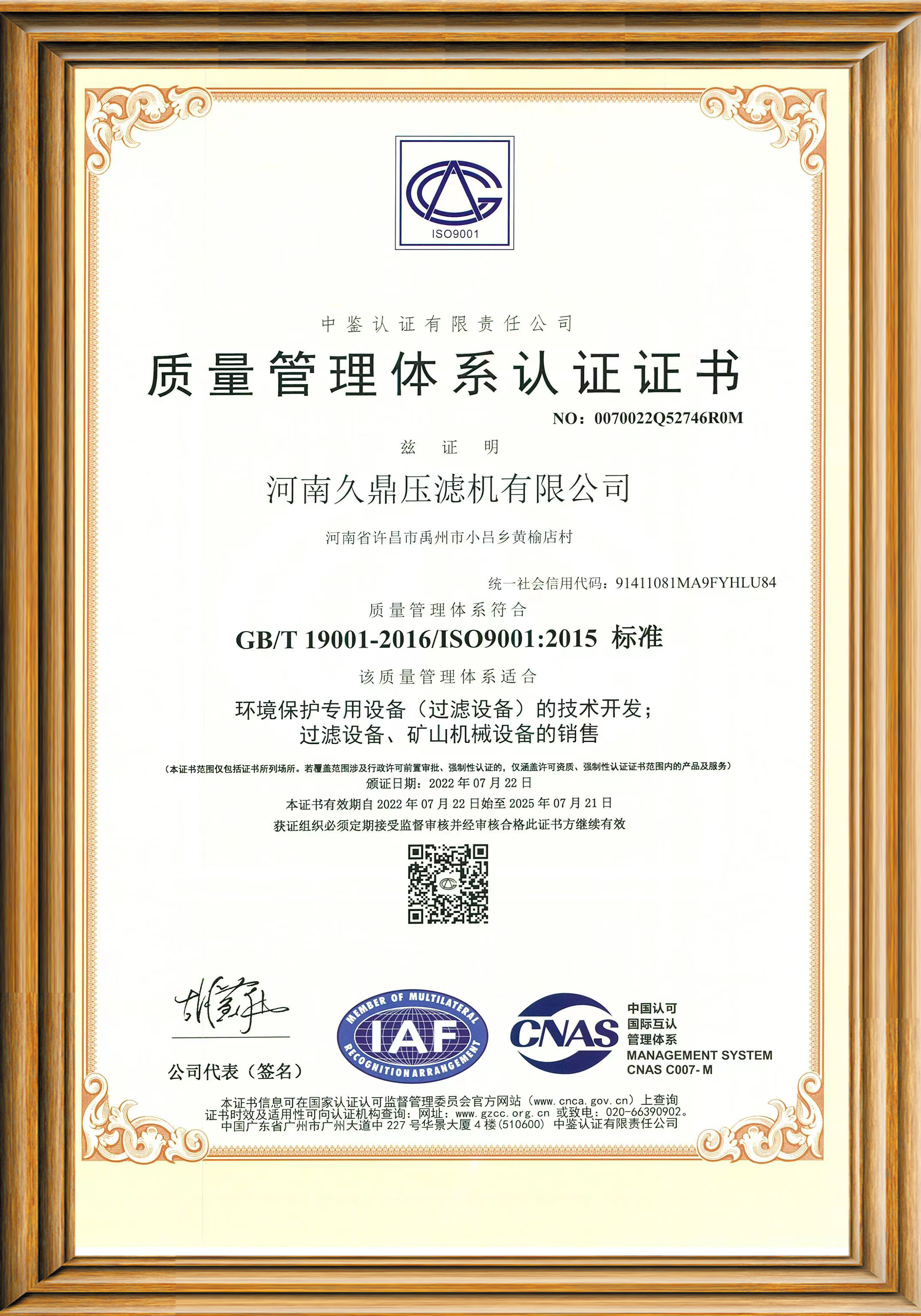 質量管理體系認證證書