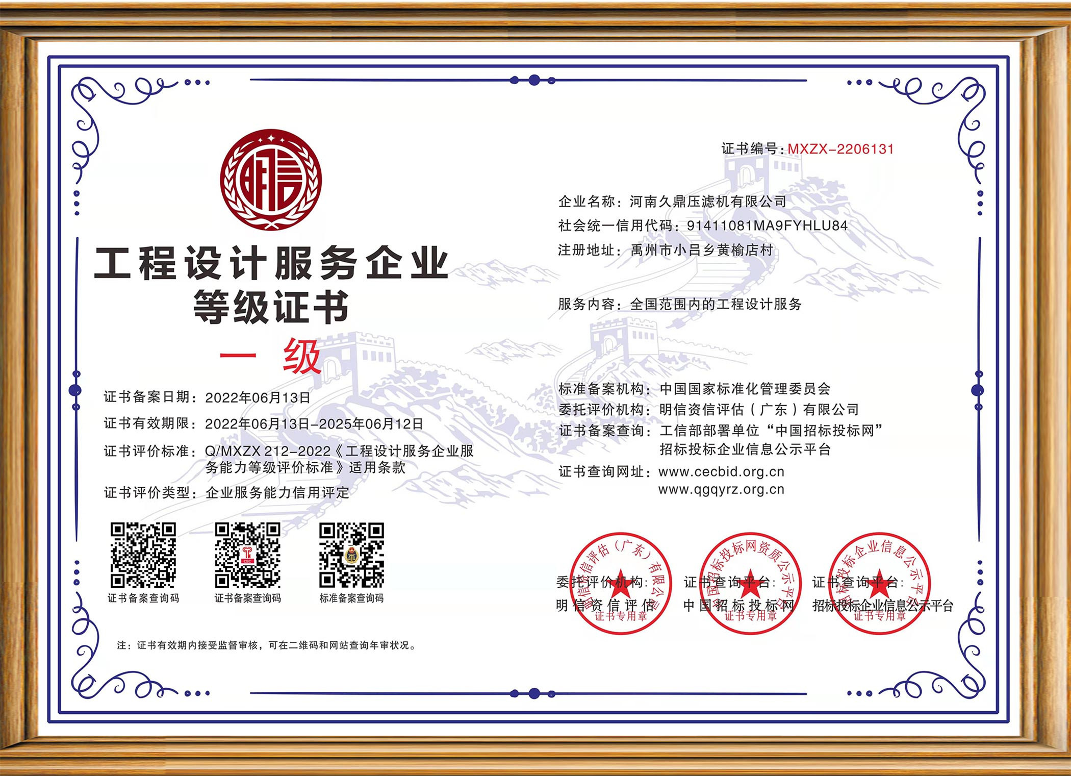 工程設計服務企業等級證書