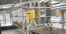 隔膜壓榨壓濾機由隔膜板和廂式濾板排列組成濾室,在輸料泵的壓力作用下將漿料輸入濾室,通過過濾介質(zhì)(濾布)將濾料中的固體和液體分離,當(dāng)漿料中的固體形成餅后,再向隔膜通入空氣,對濾室內(nèi)的固體充分壓榨,降低含水率。對于粘性物料的過濾及對含水率要求較高的用戶,此機更有其獨特的特性。
